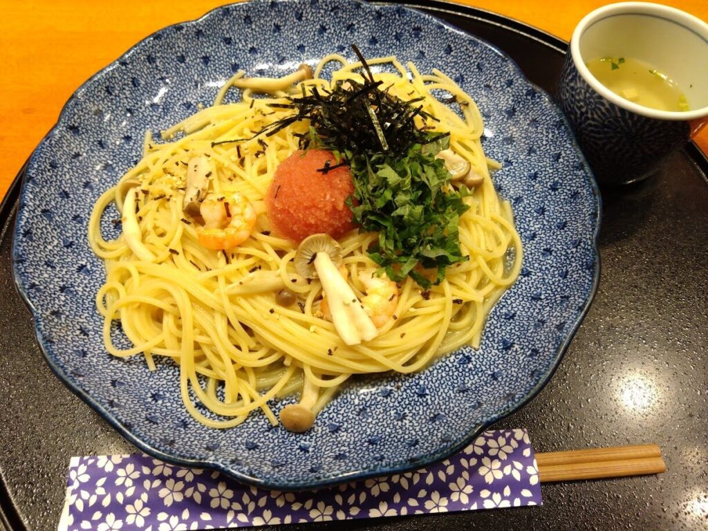 ↑よにのちゃんねる聖地巡り 「五右衛門」さんで明太子と海老としめじの青じそ風味